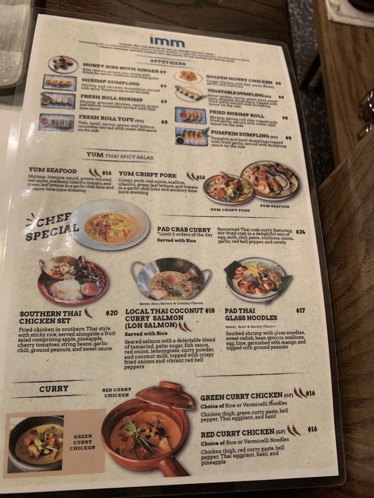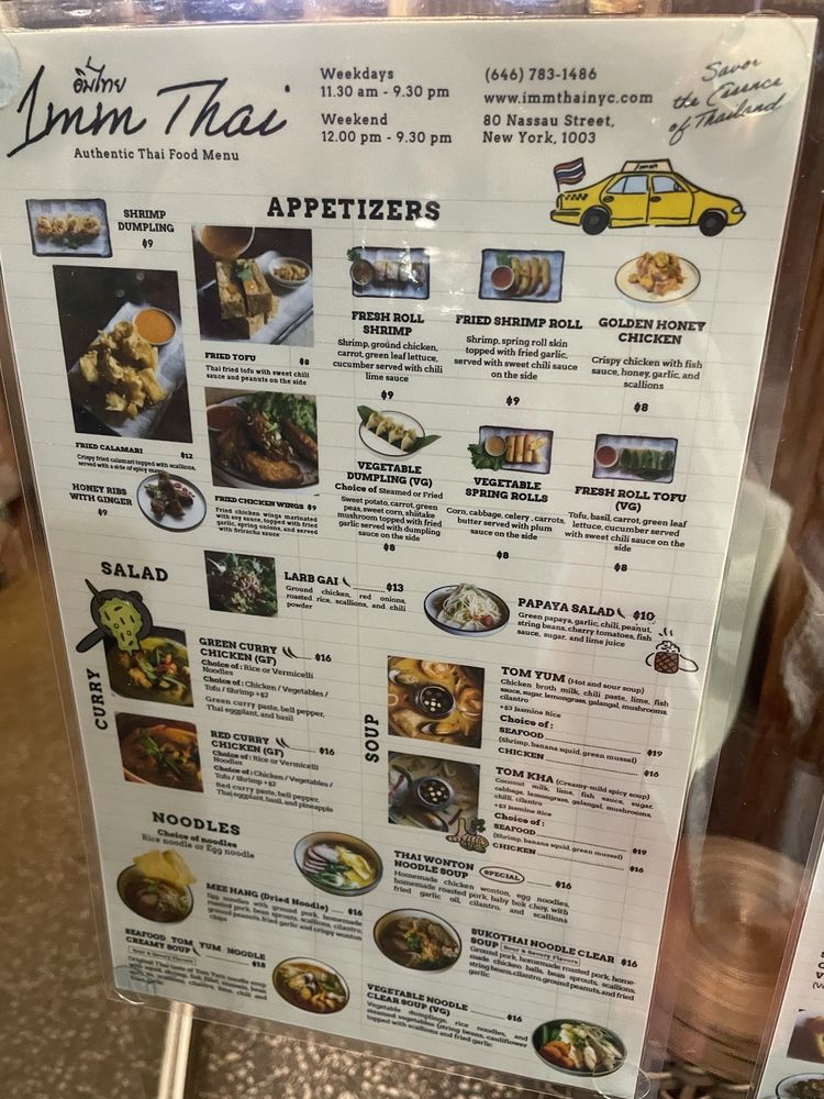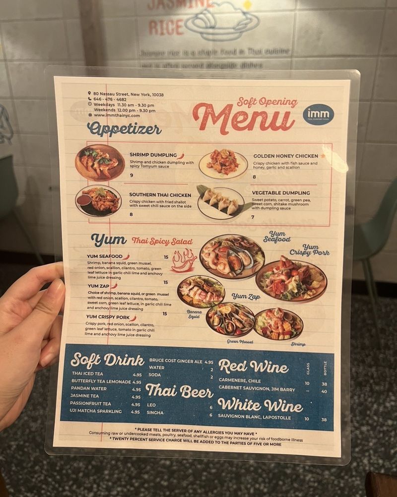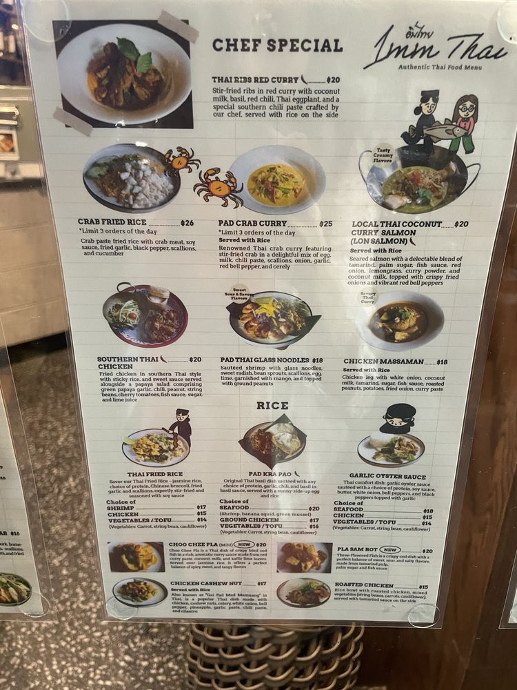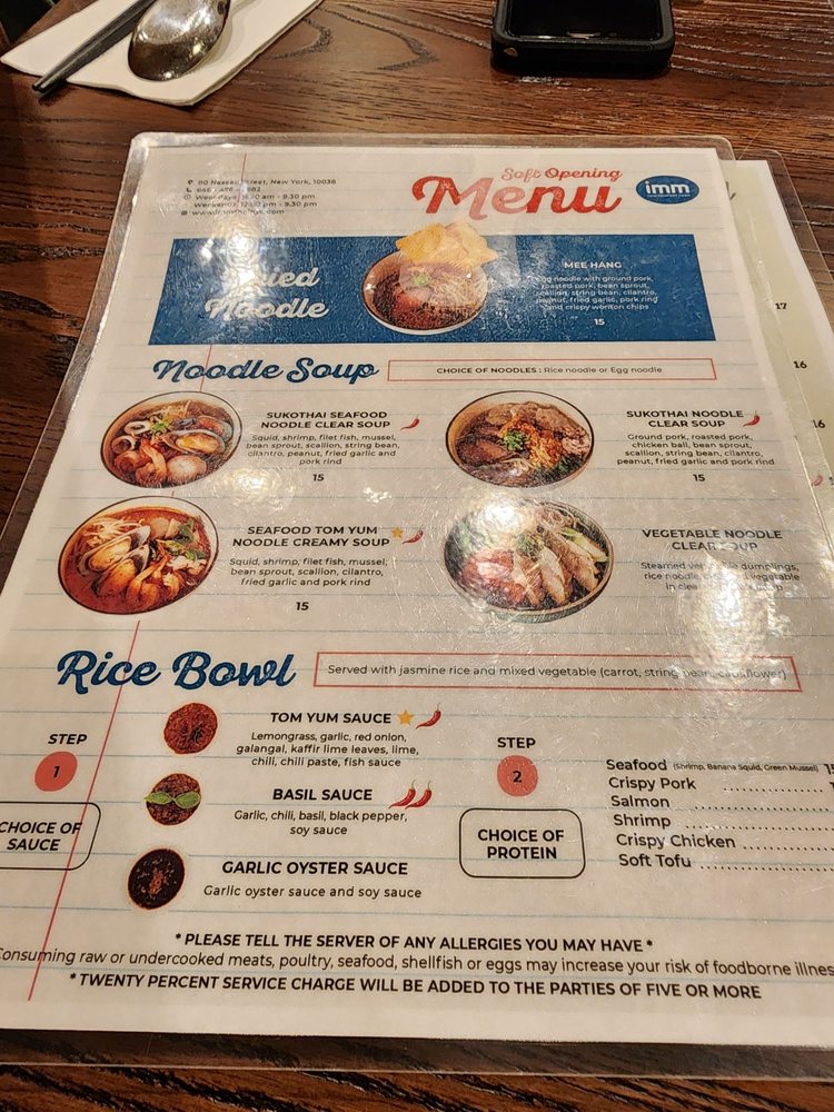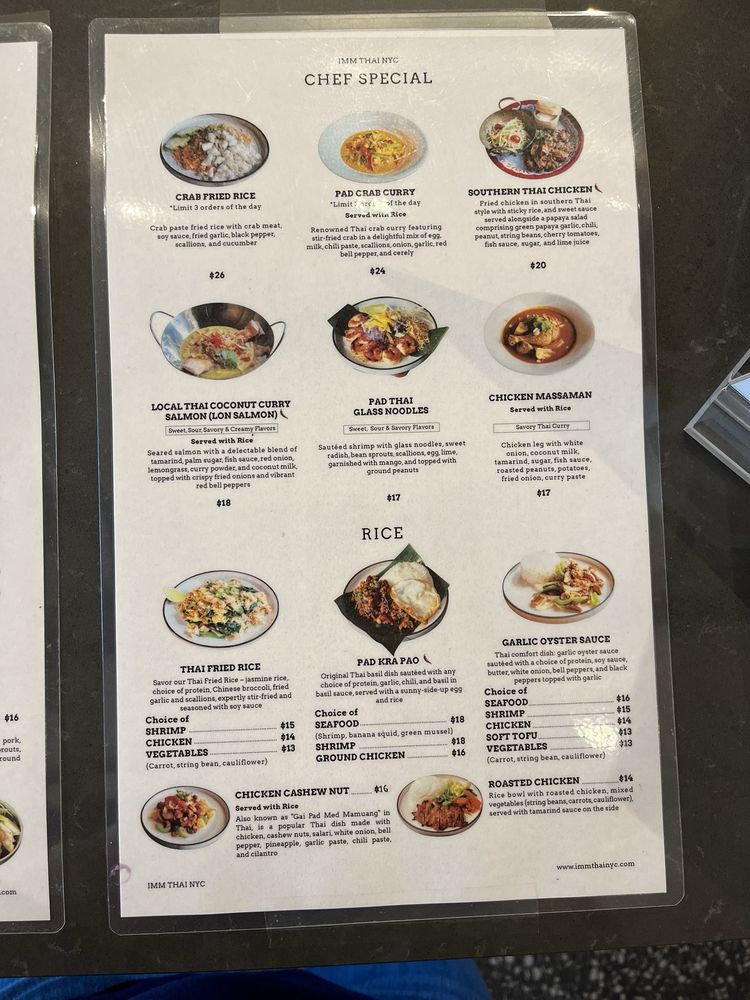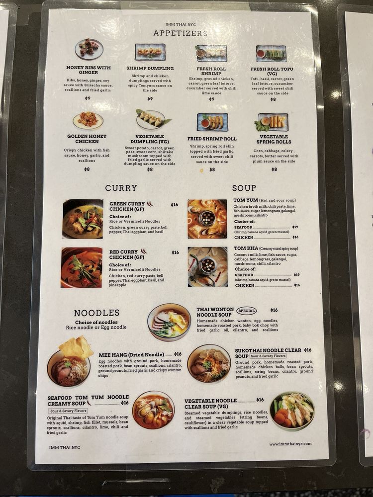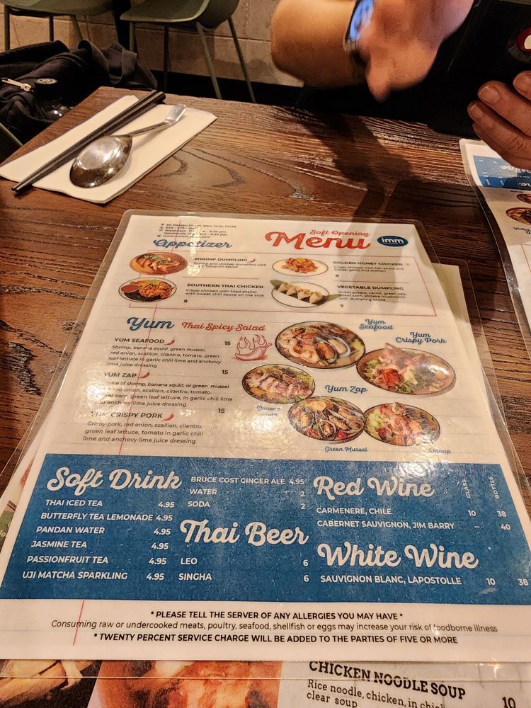 Introducing "Imm Thai NYC," a Thai seafood restaurant located in New York City. The menu offers a variety of appetizers, noodle soups, and salads. Customer reviews praise the cozy atmosphere, attentive staff, and unique dishes like the choo chee pla and green curry. Specialty dishes like the Southern Thai Chicken and Sukothai Seafood Noodle Soup are highlights. The restaurant also offers delivery and takeout options, making it convenient for diners. Overall, "Imm Thai NYC" is a great spot for those looking to experience authentic Thai flavors in a welcoming setting.